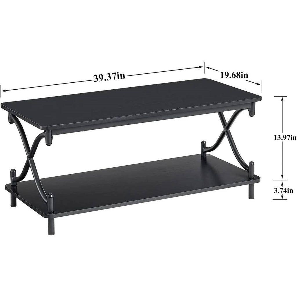 This Modern Industrial Black Metal Wood Coffee Table with Bottom Storage Shelf designed with a retro surface and X-design metal frame creates a clever look. This center table is compatible with any room style and decor in the living room, reception room, or apartment. Overall dimension: 39.37"(L) x 19.68"(W) x 17.71"(H). This coffee table crafted with a spacious tabletop and a 2-tier open shelf provides enough space for your magazines, drinks, remotes, vases, snacks, plants, games, TV accessories, etc and more. Storing your clutter on the bottom when you need to do work on the top, the bottom shelf will help you keep the living room and apartment organized. This coffee table is made of high-quality density engineer wood and sturdy steel frame, ensuring a long life span, durable and stable, easy to clean. Packed with detailed instructions, labeled accessories and installation tools. The part was easy to assemble with the given instructions manual and it was neatly packed.