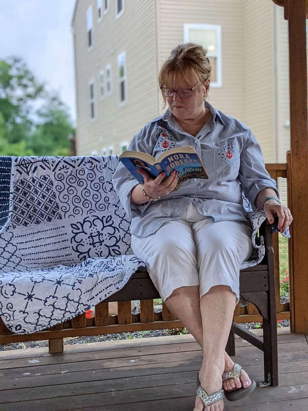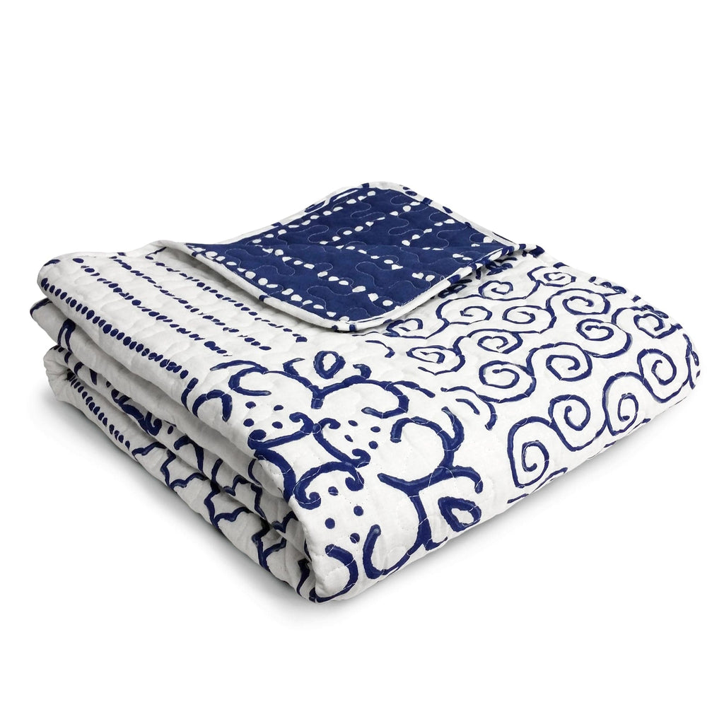 The front of this Monique Throw features a navy and white patchwork design of geometric patterns printed on 100% cotton. The reverse side features a simple stripe pattern to complement the front. Each side brings its own unique style to the space.
