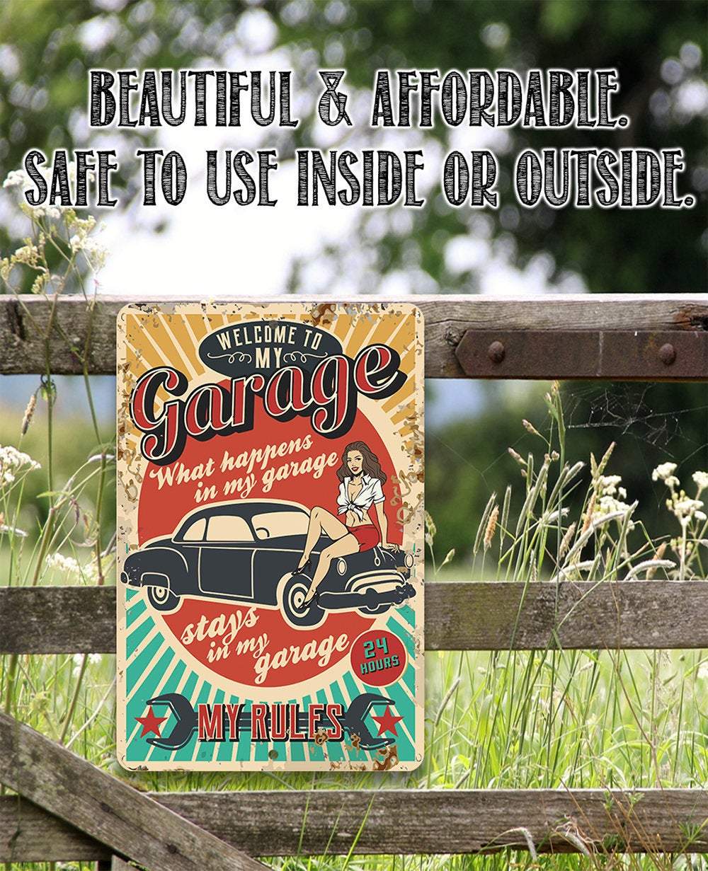My Garage My Rules-Metal Sign - 8" x 12" or 12" x 18" Indoor/Outdoor-For Garage and Automotive Repair Shop The Perfect Gift - A truly unique gift guaranteed to bring a smile Durable - 8" x 12" or 12" or 18" Aluminum metal sign printed with epoxy ink so you can hang it inside or outside Easy to Hang - Comes with two screw holes and it's light enough to be mounted with double-sided foam tape or Command Strips. Guarantee - I'm so sure you're going to love the sign. Made in the USA (Tomball, Texas) in our family-owned shop