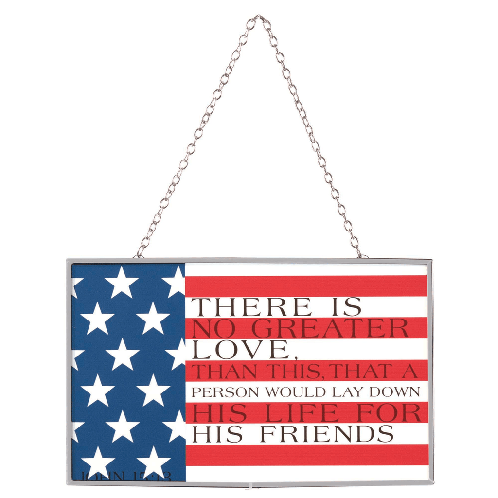 Featuring an inspiring message overlaying a portion of the American flag, this stained glass style suncatcher serves as a poignant reminder of bravery and sacrifice. The text reads: There is no greater love than this, that a person would lay down his life for his friends, making it a heartfelt tribute to love and friendship.