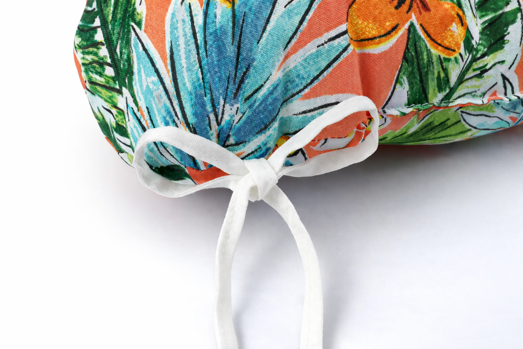 - Tufted stitching with attached ties for secure fit and shape retention