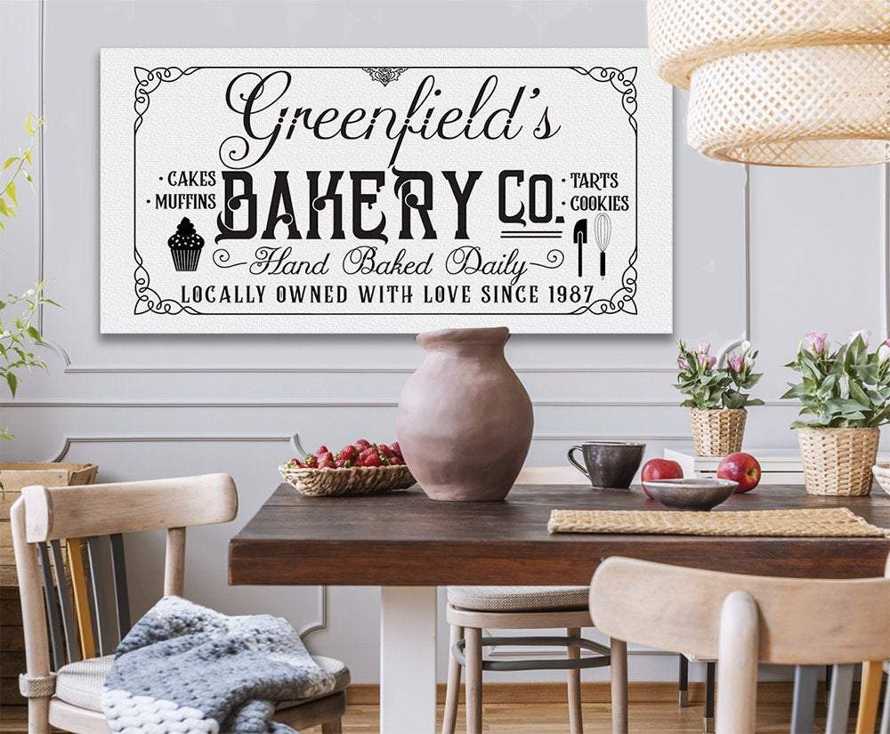 Personalized - Family Name Bakery-Large Canvas Wall Art-Stretched on a Heavy Wood Frame-Kitchen Dining Room Decor-Housewarming Wedding GiftBring an elegant touch to any room! This large, vivid colored artwork adds the perfect focal point to any room.UPDATED DESIGNS - We created this design to be on trend with an elegant, timeless style that will greatly complement your homeMADE IN AMERICA - All our canvas artwork is hand-stretched by our employees in Tomball, Texas. We take pride in doing the work here and doing it right.REAL WOOD - We only use real pine 1.5" stretcher bars. We never use cheap particleboard stretcher bars like other sellers.PREMIUM CANVAS - So much of what goes into the final reproduction depends on the quality and consistency of the canvas. We only use acid-free, heavy canvas, which is not only durable but will not degrade over time. The surface has been specially prepared to accept and hold the inks, allowing them to radiate the brilliant color.PREMIUM INKS - The canvas is printed one at a time with the finest UV resistant inks using the latest high-resolution giclee printers. As the ink is laid on the matched and coated canvas, the result is an absolutely opaque, rich and brilliant reproduction. In addition, the UV properties of the ink ensure a fade-resistant, long-lasting beautiful image for decades.HAND STRETCHED - To ensure that the canvas remains taught, it is hand stretched around hardwood stretcher bars, fixed using no less than one staple per inch.THE ART - Now that you know how much effort goes into each piece, itâs time to do the most important stepâ¦selecting your favorite image... Click the Select Options button to start your order