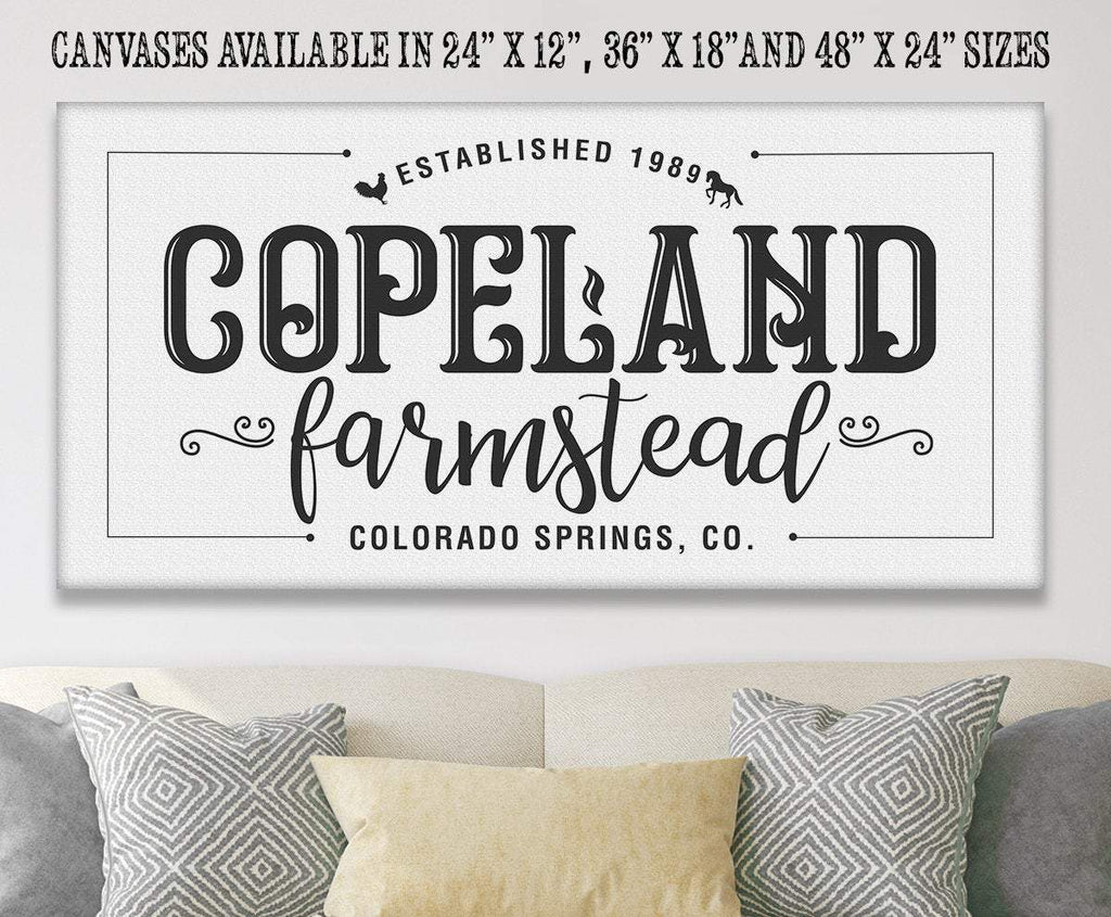 Personalized - Family Name Farmstead - Large Black and White Canvas Wall Art - Stretched on a Heavy Wood Frame - Perfect Above a Couch or Headboard Farm House Decor - Housewarming GiftBring an elegant touch to any room! This large, vivid colored artwork adds the perfect focal point to any room.UPDATED DESIGNS - We created this design to be on trend with an elegant, timeless style that will greatly complement your homeMADE IN AMERICA - All our canvas artwork is hand-stretched by our employees in Tomball, Texas. We take pride in doing the work here and doing it right.REAL WOOD - We only use real pine 1.5" stretcher bars. We never use cheap particleboard stretcher bars like other sellers.PREMIUM CANVAS - So much of what goes into the final reproduction depends on the quality and consistency of the canvas. We only use acid-free, heavy canvas, which is not only durable but will not degrade over time. The surface has been specially prepared to accept and hold the inks, allowing them to radiate the brilliant color.PREMIUM INKS - The canvas is printed one at a time with the finest UV resistant inks using the latest high-resolution giclee printers. As the ink is laid on the matched and coated canvas, the result is an absolutely opaque, rich and brilliant reproduction. In addition, the UV properties of the ink ensure a fade-resistant, long-lasting beautiful image for decades.HAND STRETCHED - To ensure that the canvas remains taught, it is hand stretched around hardwood stretcher bars, fixed using no less than one staple per inch.THE ART - Now that you know how much effort goes into each piece, itâs time to do the most important stepâ¦selecting your favorite image... Click the Select Options button to start your order