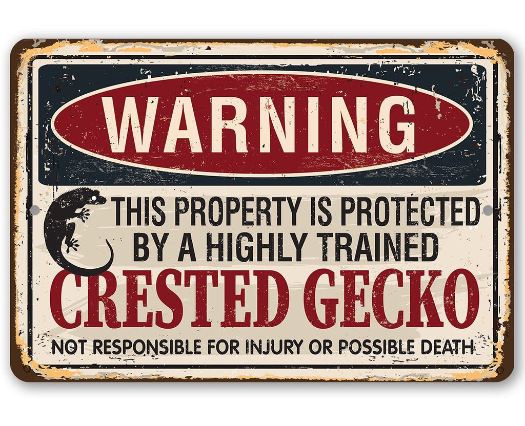 Metal Sign - Warning Property Protected By Crested Gecko - Durable Metal Sign - 8" x 12" or 12" x 18" Use Indoor/Outdoor - Gift for Exotic Animal Lovers