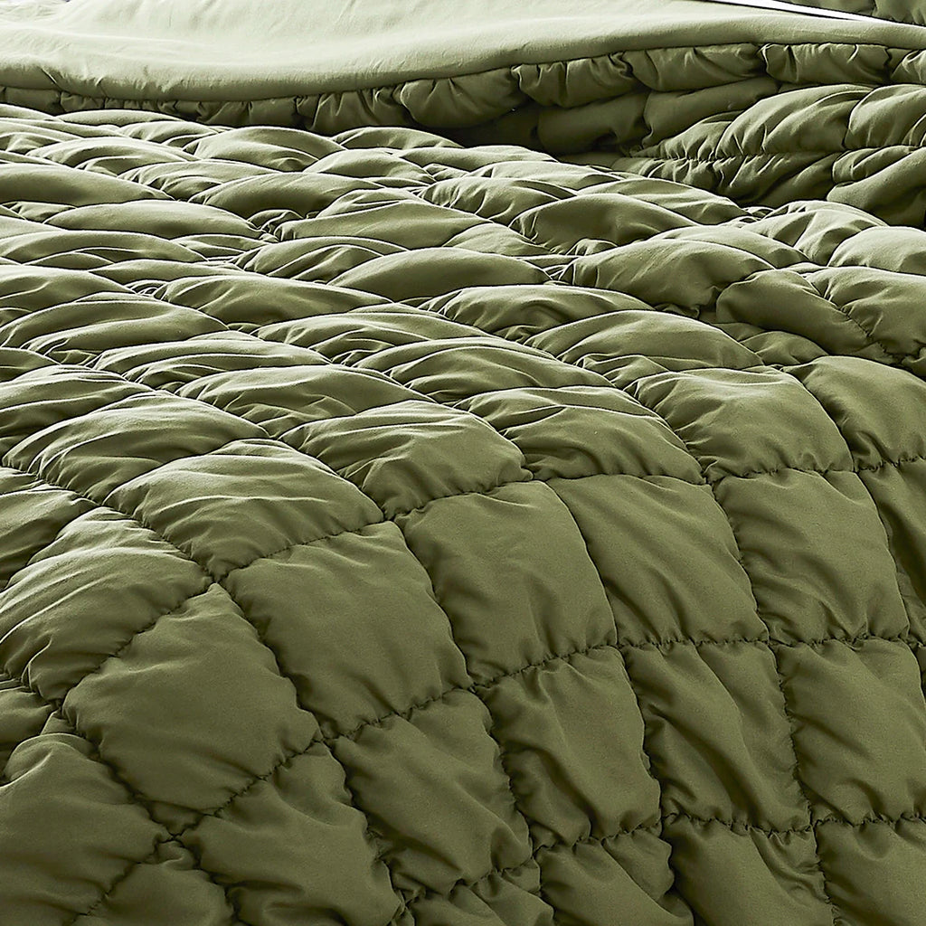 This Puff Comforter Set includes 1 comforter and matching pillow sham(s). This crinkle microfiber bedding set offers superior softness and comfort. The polyfill is perfect for hot sleepers and great as an extra layer for those cold sleepers who layer-up to keep warm.