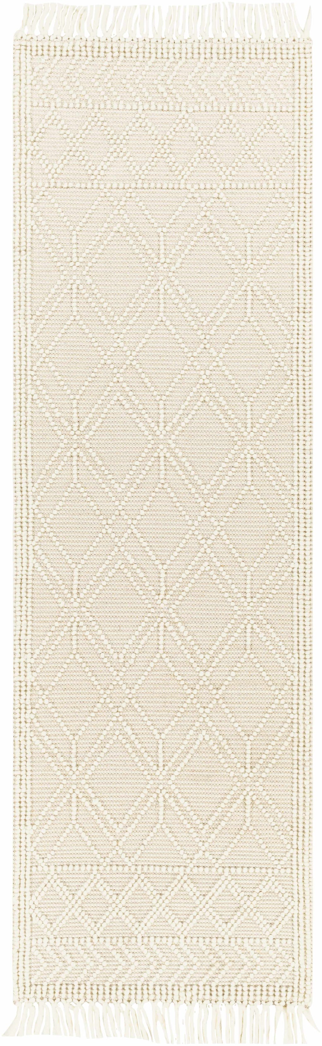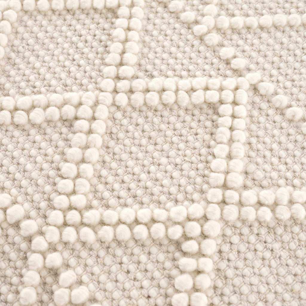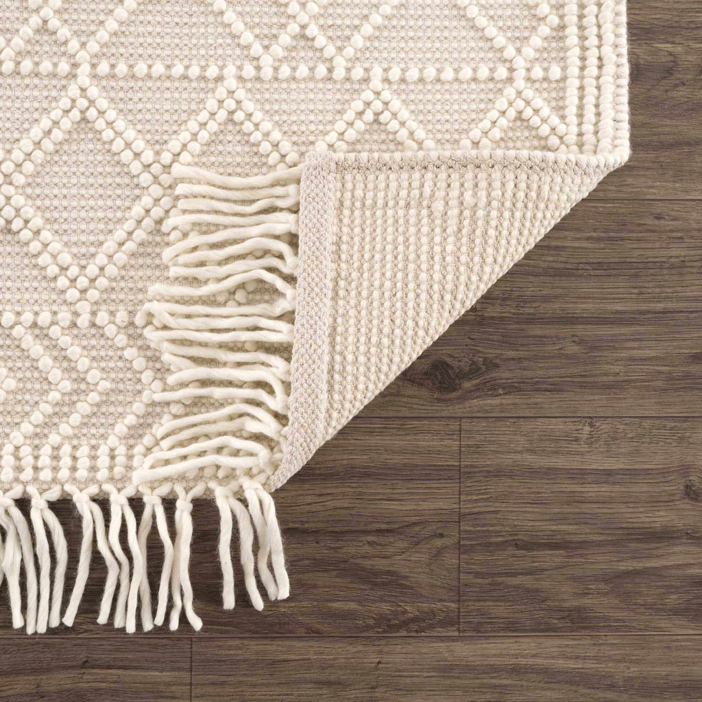 About: This hand-woven wool and cotton rug features a sophisticated trellis pattern, offering a blend of traditional charm and contemporary elegance. The high-low texture of the rug adds a unique tactile element, enhancing its visual appeal and comfort underfoot. Adorned with tasteful tassels, this rug brings a classic yet modern touch to any room. Its combination of wool and cotton materials ensures durability while providing a soft, inviting surface, making it a luxurious and practical choice for any living space.