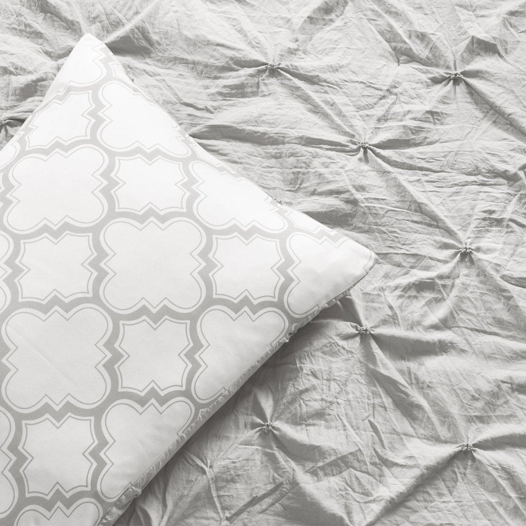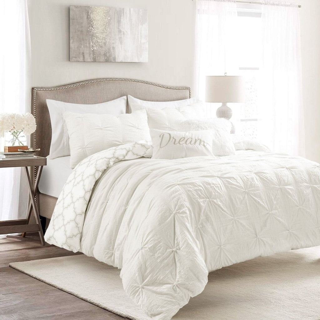The Ravello Pintuck Caroline Geo 7 Piece Comforter Set includes a soft and luxurious 210 GSM comforter, two matching pillow shams, two pillow cases and two unique decorative throw pillows. It is available in both King and Full/Queen sizes in your choice of white, neutral, and light gray.