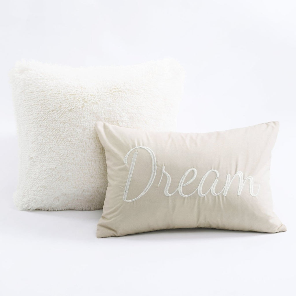 - 7-Piece Set Includes: One Comforter, Two Pillow Shams, Two Pillow Cases, Two Decorative Throw Pillows