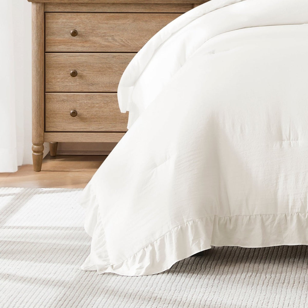 New from the Reyna Collection is this beautiful comforter set with a frilly ruffled border which will brighten any bedroom. This set is perfect for the lovers of minimalist, farmhouse, boho or shabby chic design styles.