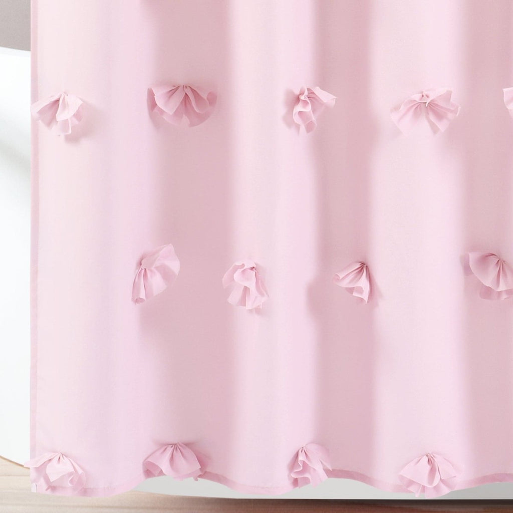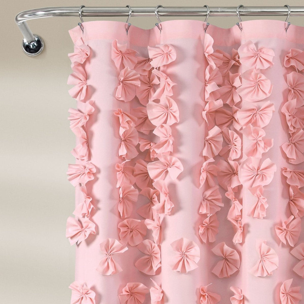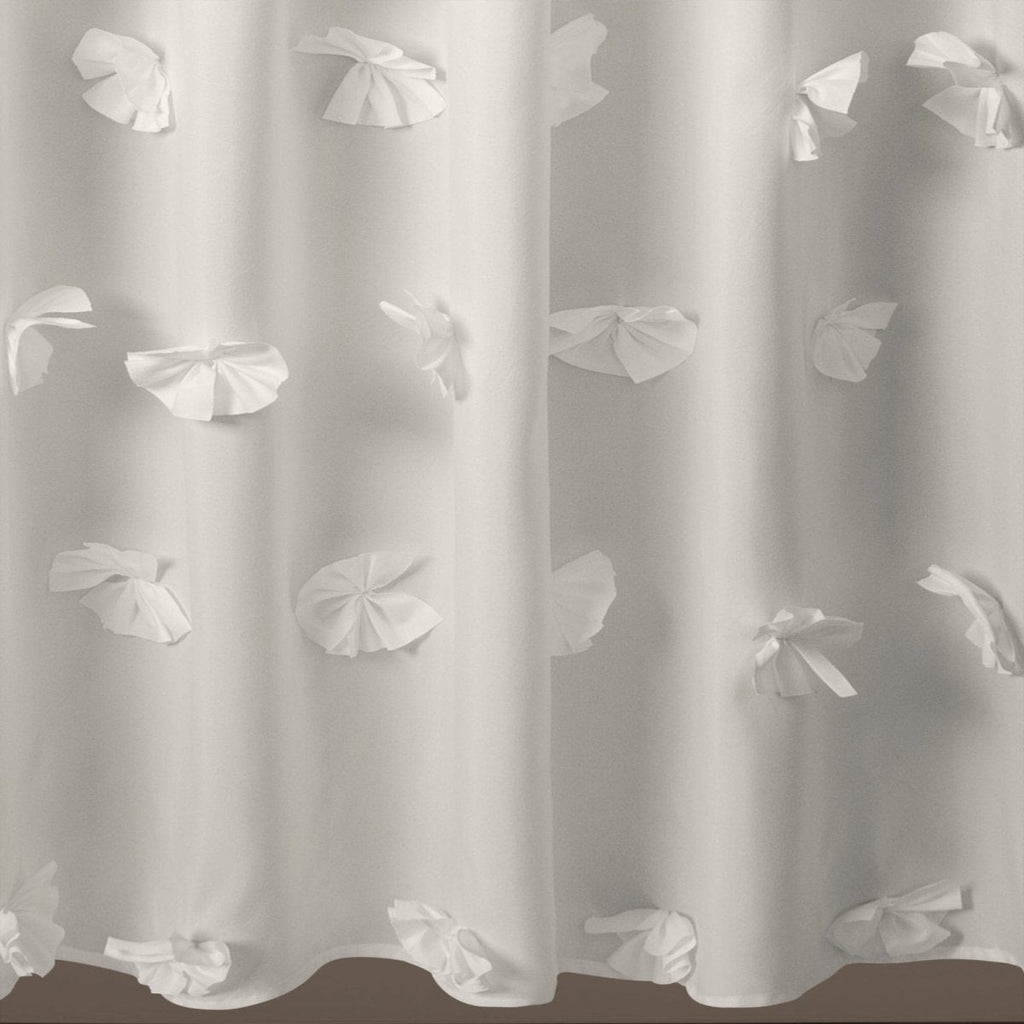 Cascades of handmade bow ties flow from top to bottom of the soft brushed poly fabric lending charm and luxury to the ambiance of your bathroom.