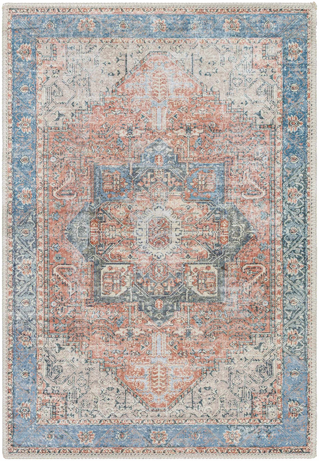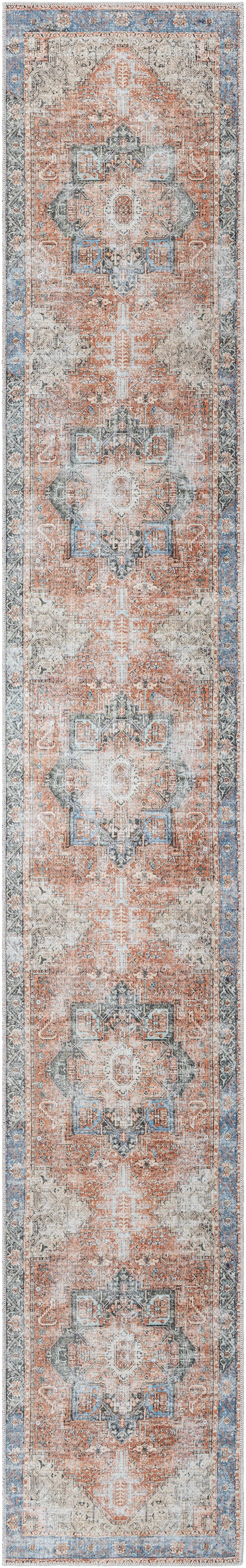 About: The composition of red, orange, and blue has been infused into this astonishing vintage rug to create a pronounced texture in your space. Besides the rich color palette, its pet-friendly and washable structure will please you more than ever.