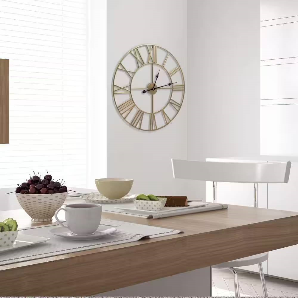 - Round 24-inch Decorative Gold Metal Wall Clock Roman Numerals and Black Hands