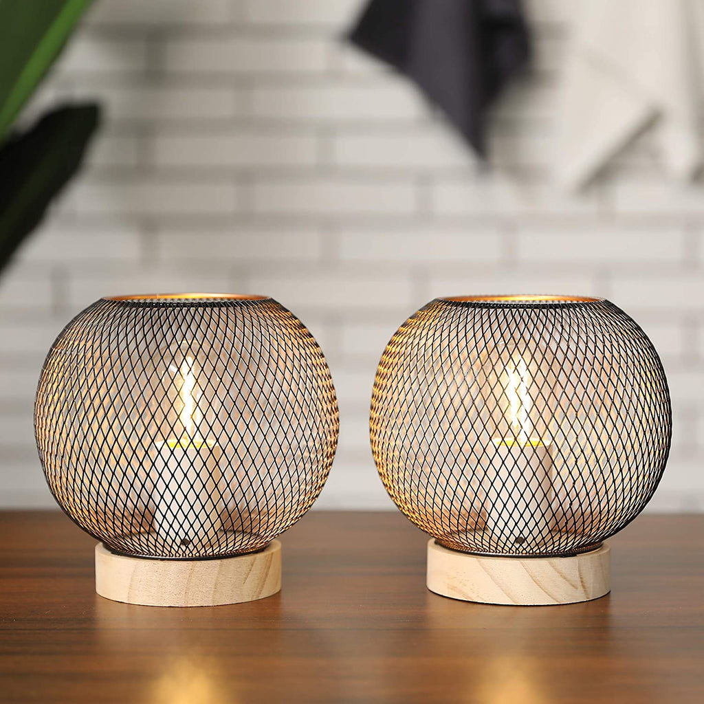Light up Your Space with 7.8” Tall Metal Mesh Battery-Powered Table Lamps (Set of 2): With Timer & Wooden Base