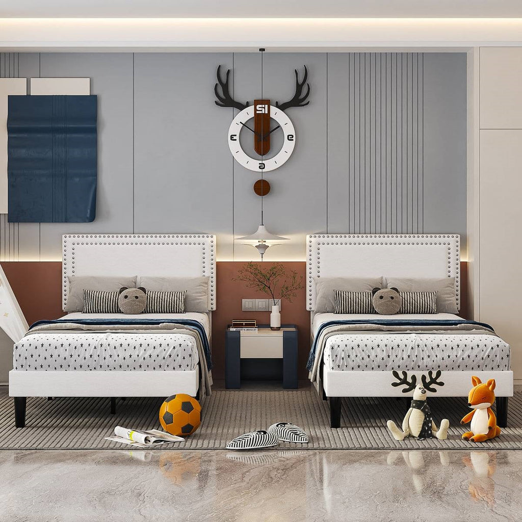 This Twin Size - Set of 2 - Dorm Style Tufted Upholstered Platform Beds comes with a minimalist design style tufted upholstered headboard that is not only comfortable but gives you a warm and soft atmosphere, the elegant and classic design can match perfectly with a variety of home décor and is an excellent addition to your bedroom. A sturdy & simple frame that blends perfectly with the style of almost any room. Adjustable height headboard fits any size and material of your mattress. Metal frame and hardwood slats support any latex, innerspring, or memory foam mattress without the added expense of a box spring. Assembly instructions are so clear and easy to follow. Come with height-adjustable upholstered headboard for any thickness and material of the mattress. No box spring needed. A metal frame and 12 hardwood slats support and extend the life of your latex, memory foam, or spring mattress. Also, making this bed does not require a box spring (pillows, quilts, mattresses, etc. are not included.). Adjustable height: The headboard comes with 4 adjustable mounting positions from 41'' to 47'', suitable for any thickness and material mattresses.