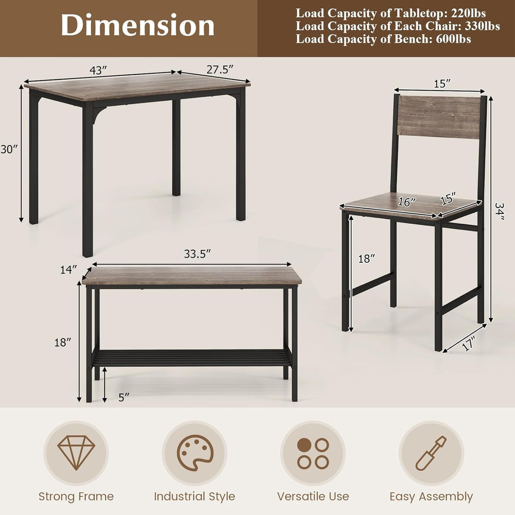 Built from solid metal and thick boards, the table set features a heavy-duty frame that supports up to 200 lbs for the table, 330 lbs per chair, and 660 lbs for the bench, delivering lasting stability and reliability for everyday meals and gatherings.