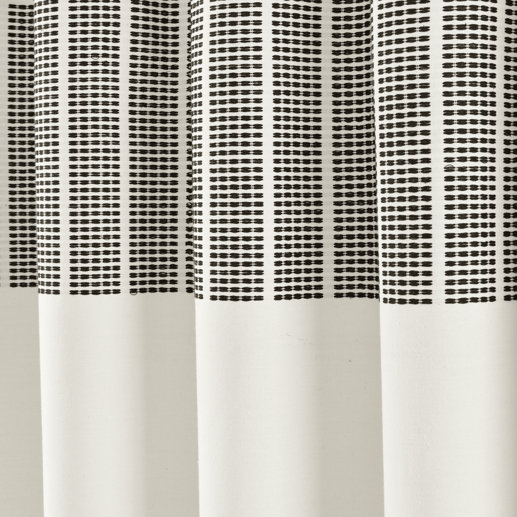 Update your master bathroom or guest bathroom with this yarn dyed recycled cotton shower curtain which features a section of stitched woven stripes across the top portion of the curtain. This Stitched Woven Stripe Yarn Dyed Cotton Blend Shower Curtain would work great in many interior design themes.