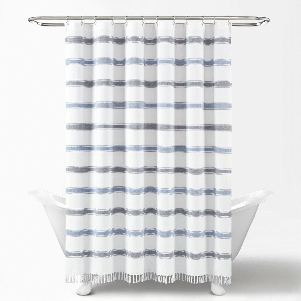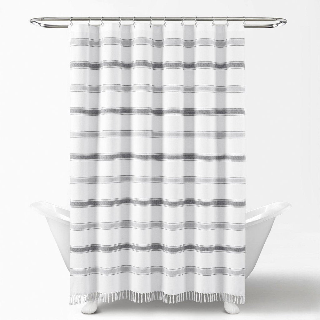 This Stripe Woven Textured Yarn Dyed Recycled Cotton Shower Curtain made with eco-friendly recycled cotton features a classic stripe design and fits in almost any bathroom setting. The tassel fringe detailing adds a stylish, unique charm to accent the traditional horizontal stripes.