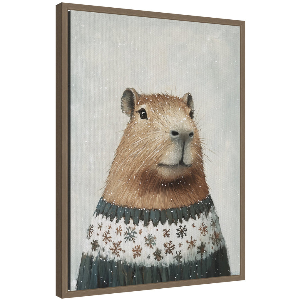 Elevate your space through thoughtfully curated style with this stunning piece designed by independent artist The Creative Bunch Studio and beautifully framed by hand in Madison, WI. The image is giclee printed using fade-resistant inks, ensuring every detail comes to life in rich, lasting color. Set in designer moulding, its a Whimsical accent crafted to make a statement. Visual Story: The artwork depicts a capybara wearing a cozy winter sweater adorned with snowflake patterns. A gentle snowfall creates a serene and whimsical atmosphere. The background features a soft, muted color palette, enhancing the calm and charming vibe of the piece.
