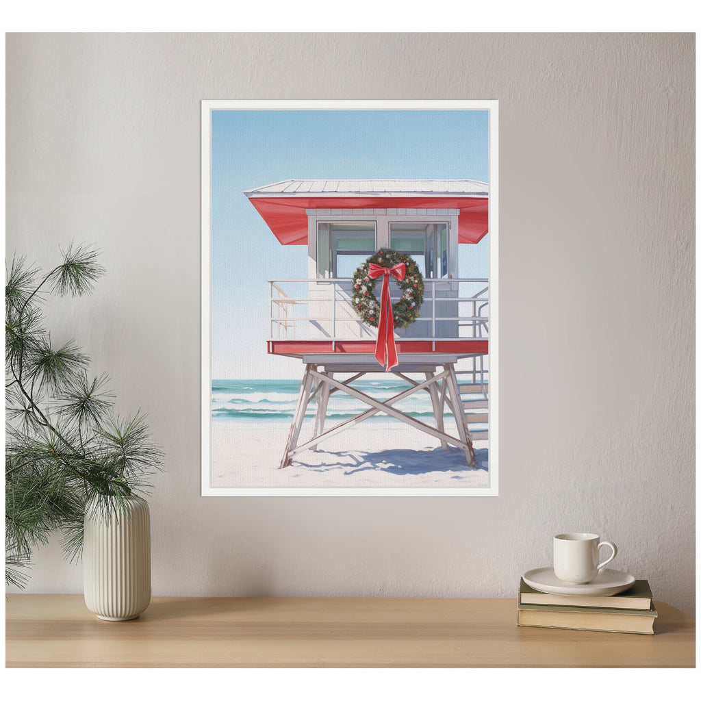 Elevate your space through thoughtfully curated style with this stunning piece designed by independent artist The Creative Bunch Studio and beautifully framed by hand in Madison, WI. The image is giclee printed using fade-resistant inks, ensuring every detail comes to life in rich, lasting color. Set in designer moulding, its a Coastal accent crafted to make a statement. Visual Story: A lifeguard hut stands on a sunny beach, adorned with a festive holiday wreath. The bright red accents of the hut contrast with the calm blues of the ocean and sky. The scene blends the warmth of summer with a touch of winter cheer.