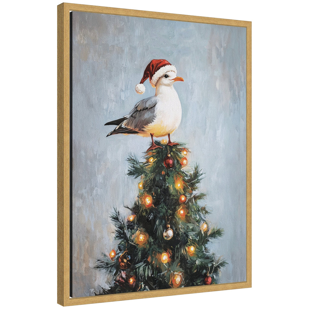 Elevate your space through thoughtfully curated style with this stunning piece designed by independent artist The Creative Bunch Studio and beautifully framed by hand in Madison, WI. The image is giclee printed using fade-resistant inks, ensuring every detail comes to life in rich, lasting color. Set in designer moulding, its a Whimsical accent crafted to make a statement. Visual Story: A seagull wearing a Santa hat perches at the top of a decorated Christmas tree. The tree is adorned with glowing lights and colorful ornaments, creating a festive atmosphere. The background features soft, neutral tones, enhancing the wintery scene.