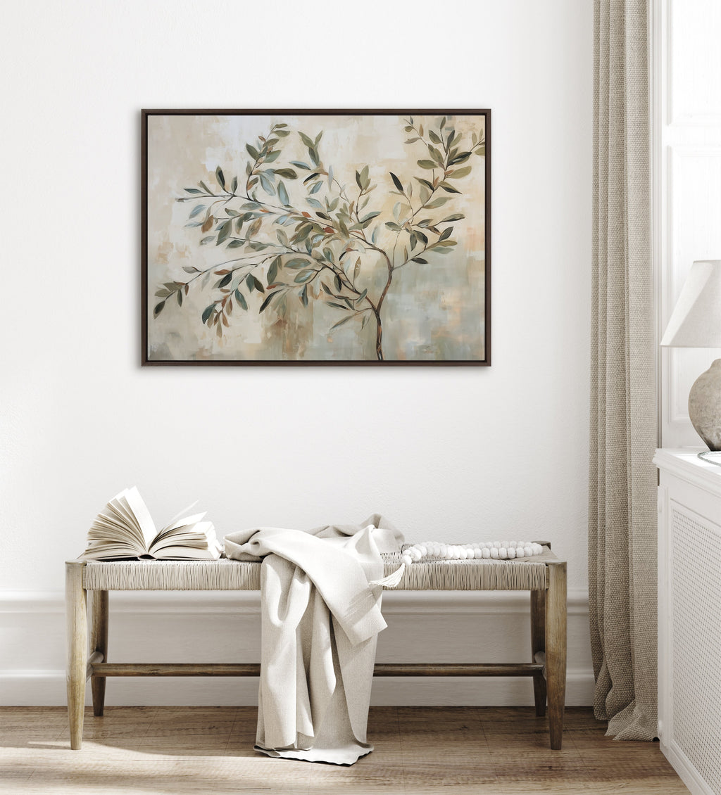 With delicate textures and organic hues, this abstract piece reflects the timeless beauty of olive trees. Printed and framed in the USA in Waunakee, Wisconsin, this framed floating canvas art will be a pleasure to look at every day in your living room, bedroom, office, or any room in the home. This art also makes an excellent gift for birthdays, holidays, or house-warming parties. Printed on gallery-wrapped canvas and framed with a lightweight polystyrene frame, this wall art is easy to display on the wall.