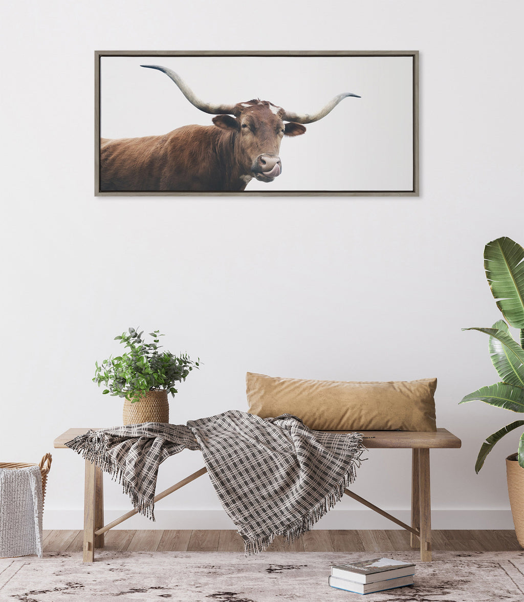This cow art is the perfect farmhouse accent piece to introduce to your home. Printed and framed in the USA in Waunakee, Wisconsin, this framed floating canvas art will be a pleasure to look at every day in your living room, bedroom, office, or any room in the home. This art print also makes an excellent gift for birthdays, holidays, or housewarming parties. Printed on gallery-wrapped canvas and framed with a lightweight polystyrene frame, this wall art is easy to display on the wall.