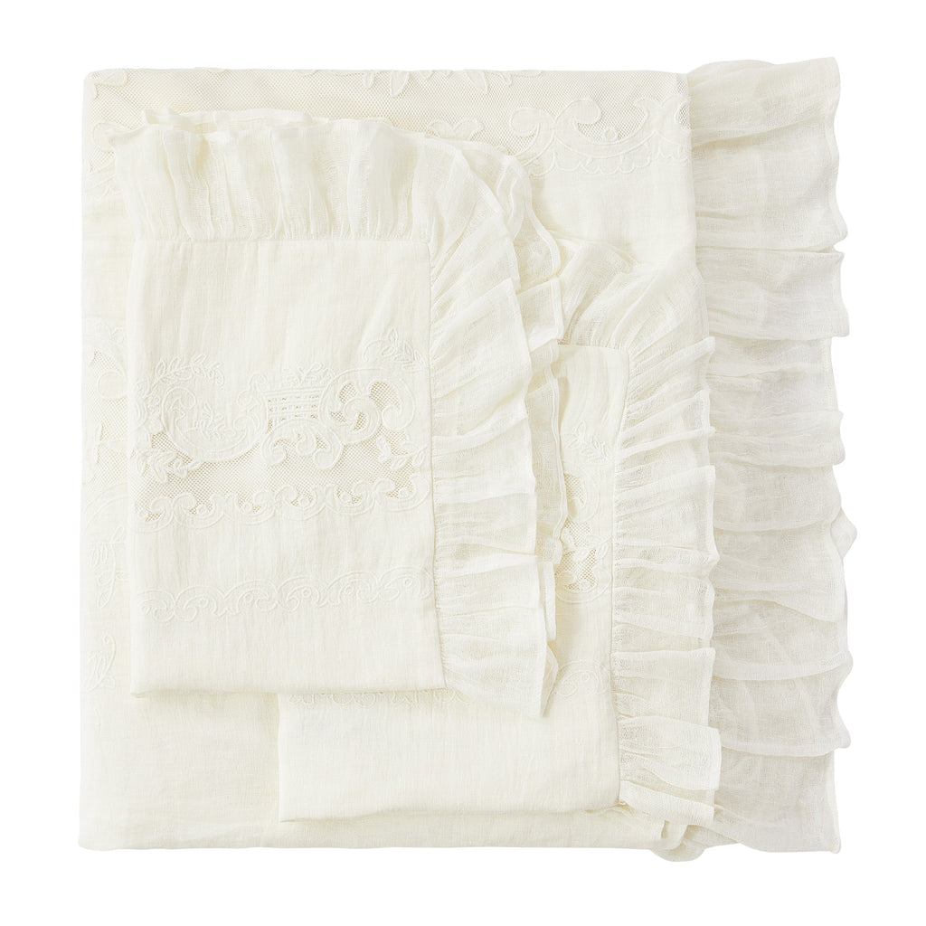 Our Tabitha Linen duvet cover set is casual elegance at its finest. Handcrafted with a linen applique overlay, crochet and pleat detailing, and a voile ruffle border, this duvet set is simply incredible. Linen is breathable, durable and softens with every wash.