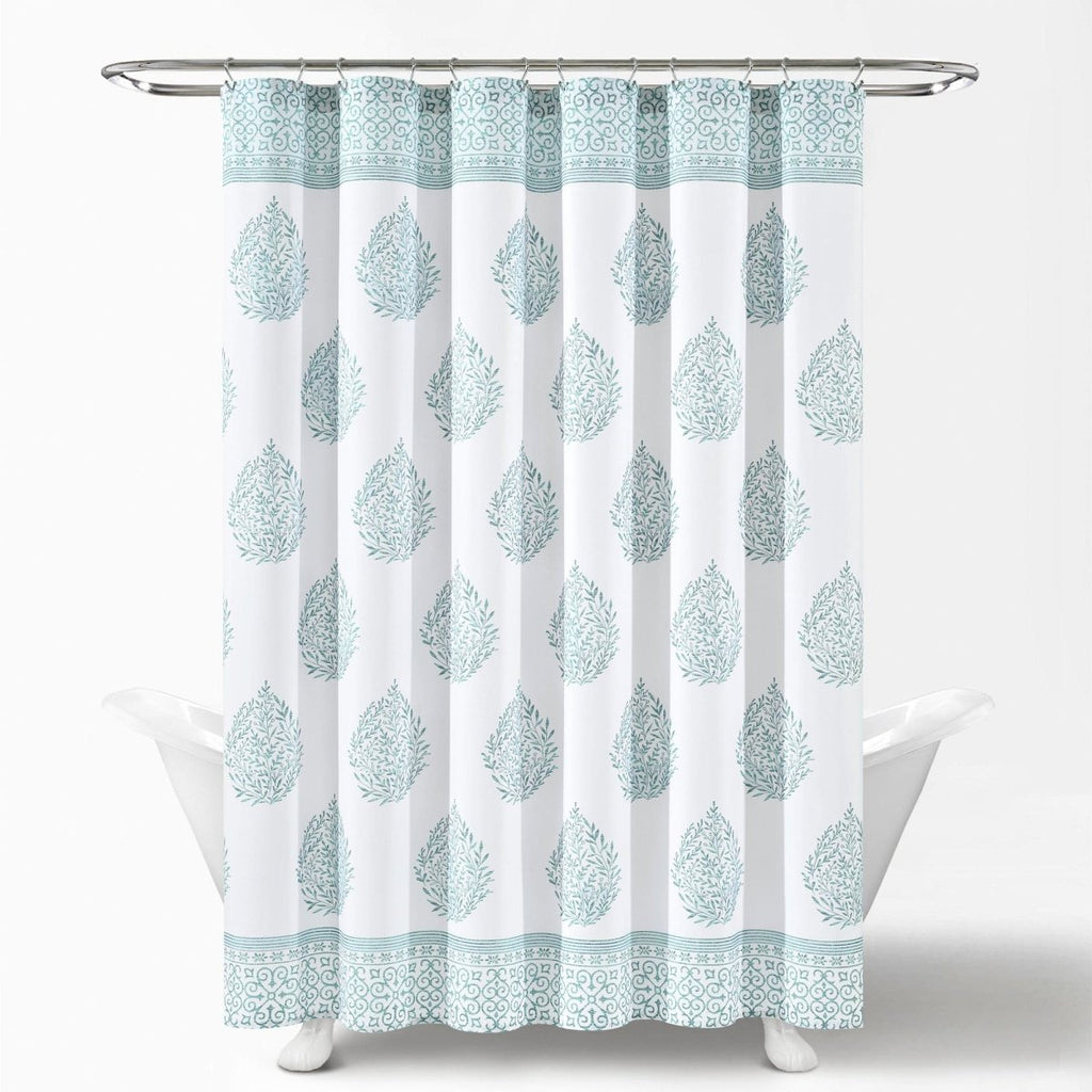 This Teardrop Leaf Shower Curtain features a pattern of teardrop-shaped leaves between two horizontal stripes of geometric shapes in soothing colors. The unique pattern of this shower curtain would look great in your master bathroom or guest bathroom.