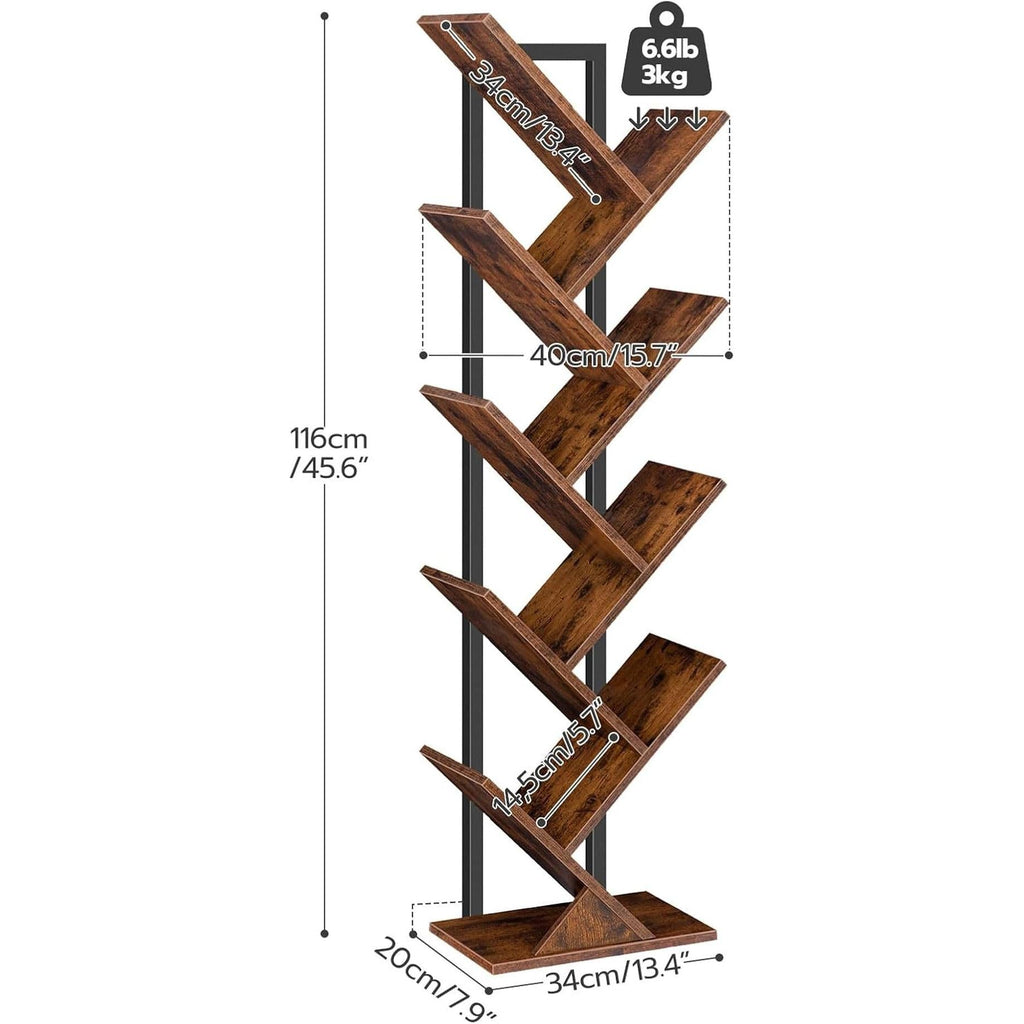 Turn clutter into a stylish display with the Tree Bookshelf — a 9-tier, floor-standing organizer that maximizes space without sacrificing beauty. This rustic brown wooden bookcase blends a unique tree-branch silhouette with a sturdy metal frame to provide durable storage for books, CDs, magazines, and decor in living rooms, home offices, bedrooms, or hallways.