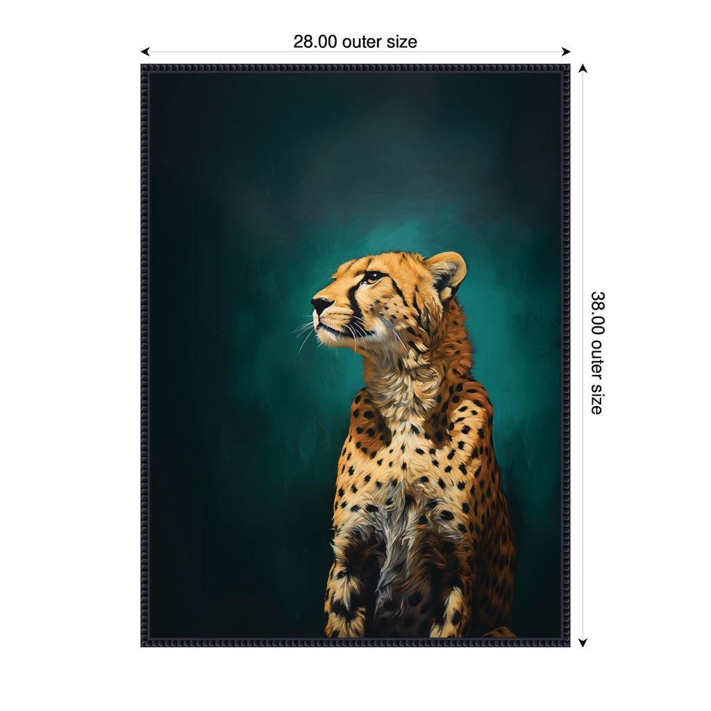 - Gallery Quality Art: Measuring 28 x 38 inches, this is beautifully presented in Sylvie Beaded Black frame - a vintage float frame featuring a traditionally beaded ornate design with black coloring, subtle antiquing and dramatic depth.. Expressive Wall Art Story:This artwork features a stunning depiction of a cheetah, capturing the animal's grace and majesty. The background is a rich, dark blue-green, accentuating the cheetah's striking spotted coat. The piece conveys a sense of calm and strength as the cheetah gazes upward.
