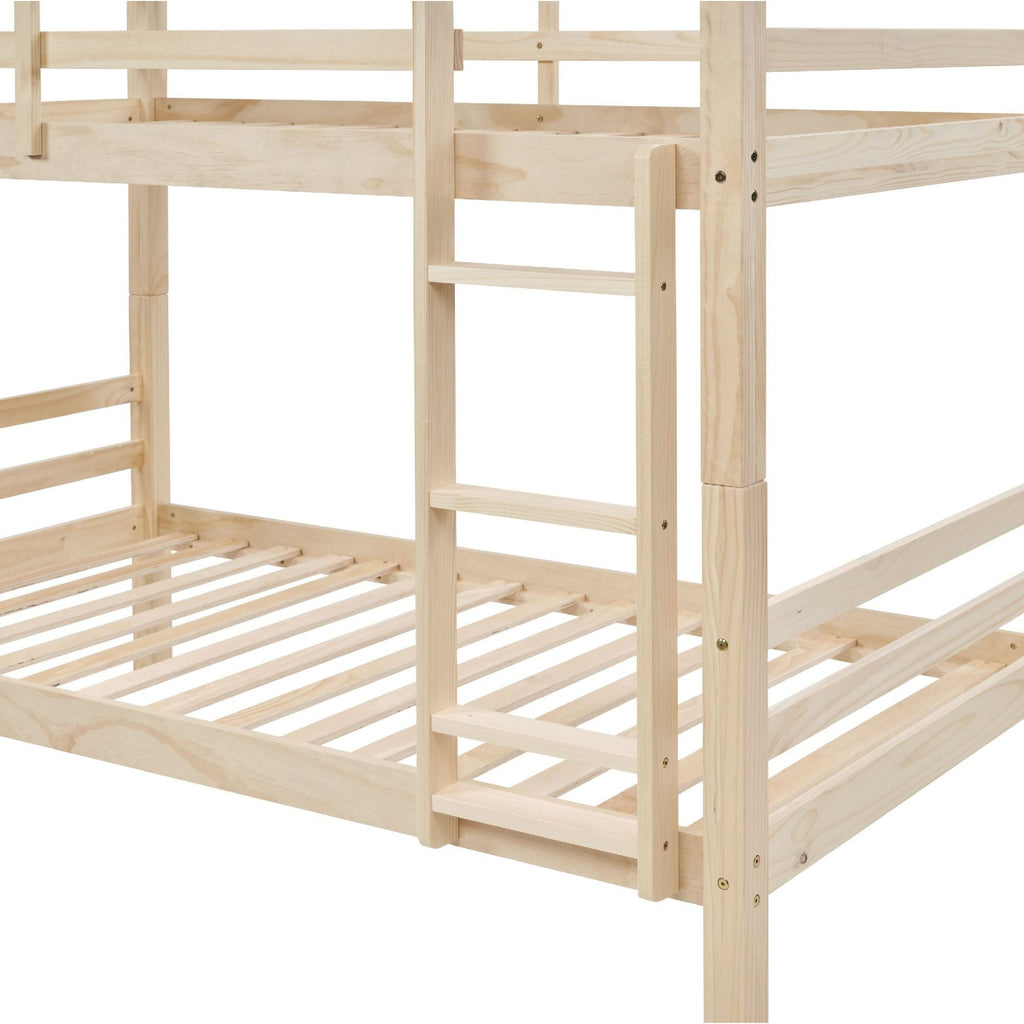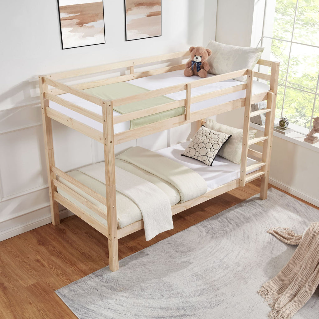 Assembled with kiln-dried solid wood members and reinforced connection hardware, the structure ensures dimensional stability and lasting quality through moisture-controlled processing and careful construction. The upper bunk incorporates high-rising safety barriers along all exposed sides, complemented by a permanently mounted ladder with extra-deep treads offering secure footing during ascent and descent