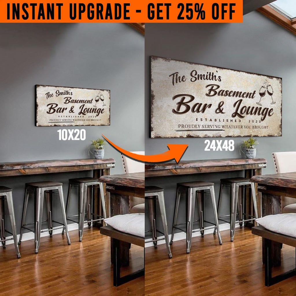 - This Upgrade Your 'Basement Bar and Lounge' (Style 2) Canvas To 24x48 Inches sign is custom-made just for you. Get it with your family name, or change the other text to something that suits you - so YOUR home will tell YOUR family story.