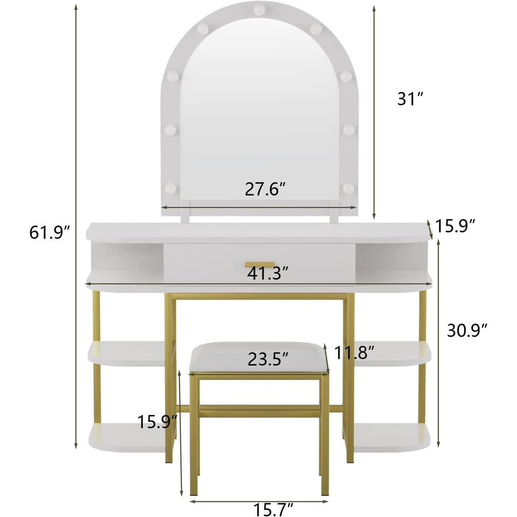 The white gold dressing table set is an luxury choice for a women or girls bedroom. Vanity with mirror, lights, drawer and shelves, matching makeup Upholstered stool, which can immediately bring modern charm to your arrangement.