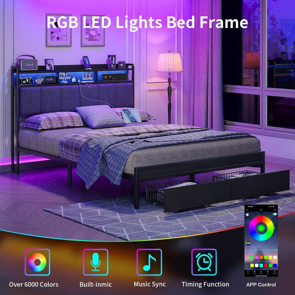 Charge devices and set the mood without leaving bed. Headboard includes 2 AC outlets, 2 USB, 1 Type-C. RGB LED lights offer 6000+ colors, music sync, and timer control for perfect ambiance.Built-In Storage: Drawers & Shelf