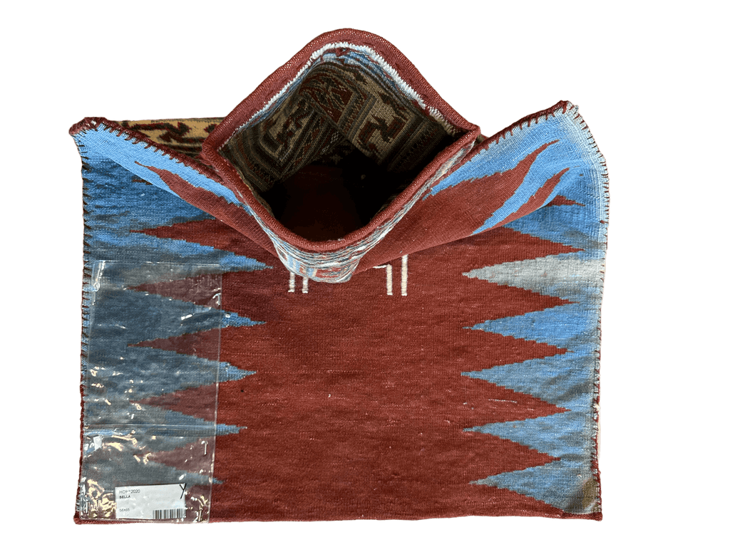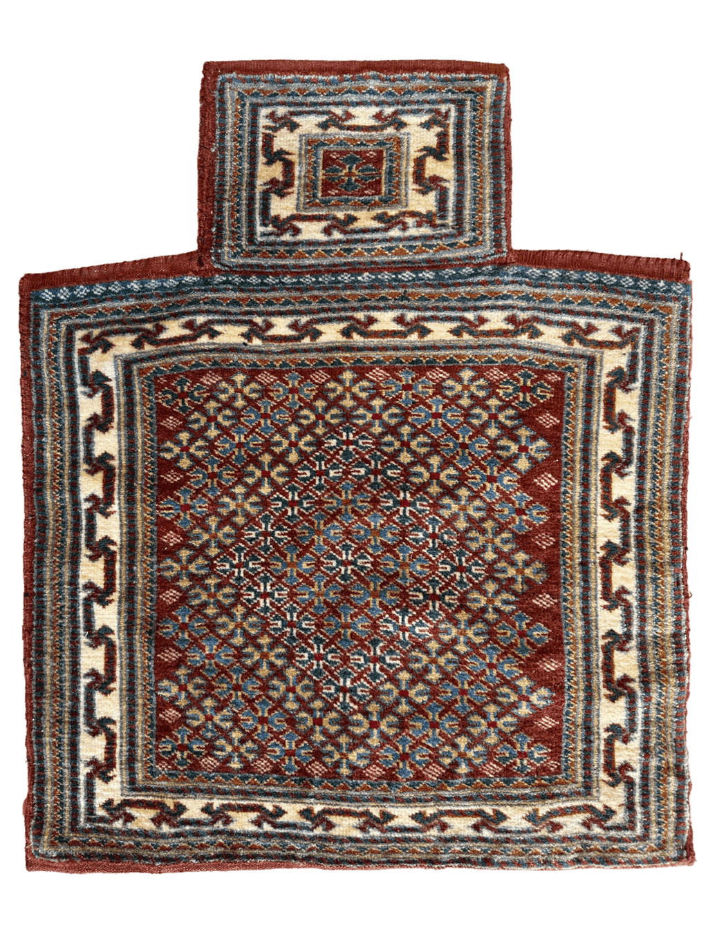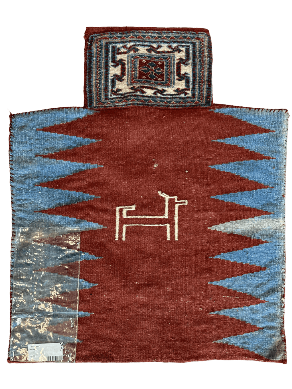 This fine nomadic salt bag rug is has amazing natural dyes and is just shining. Stunning colors and a great choice for display.
