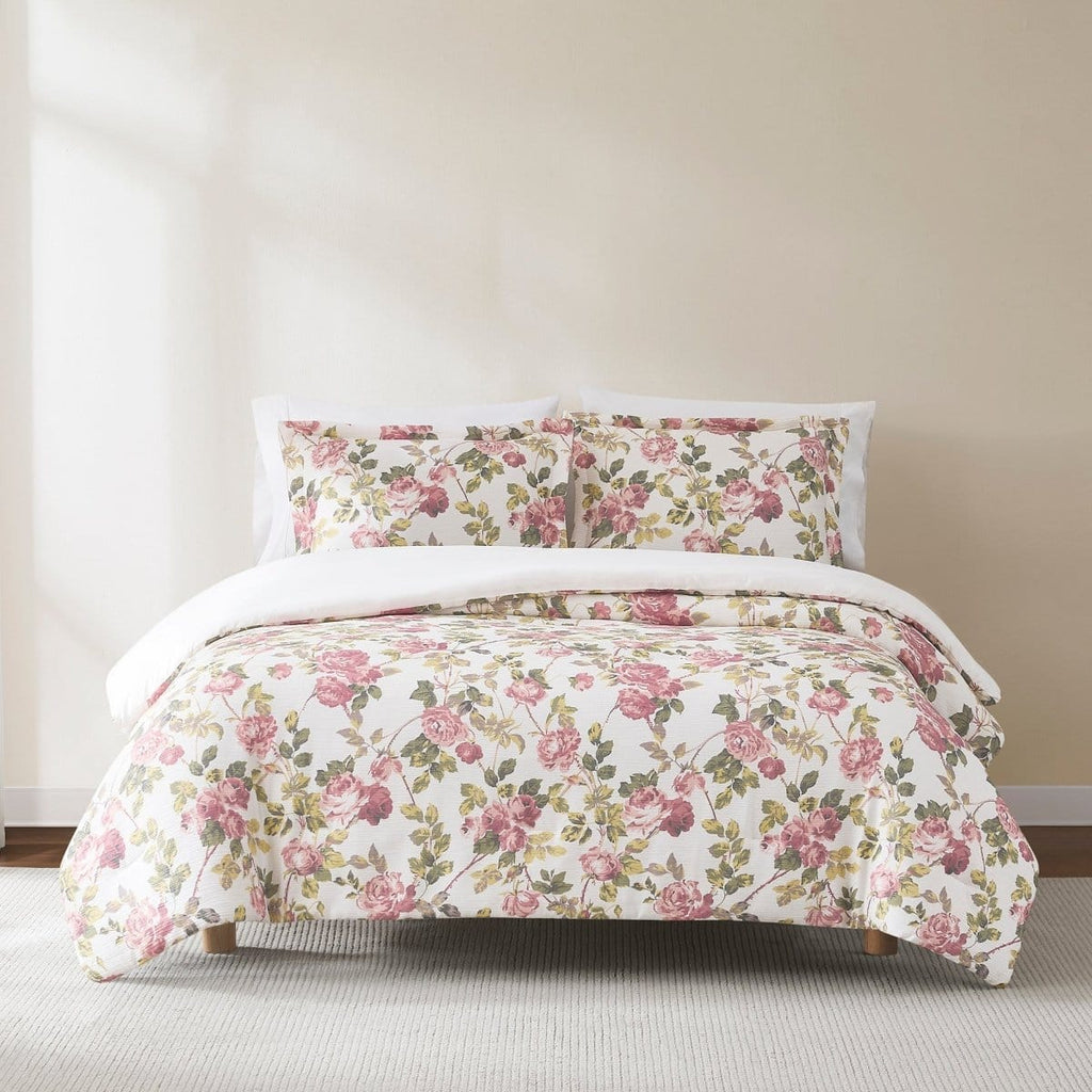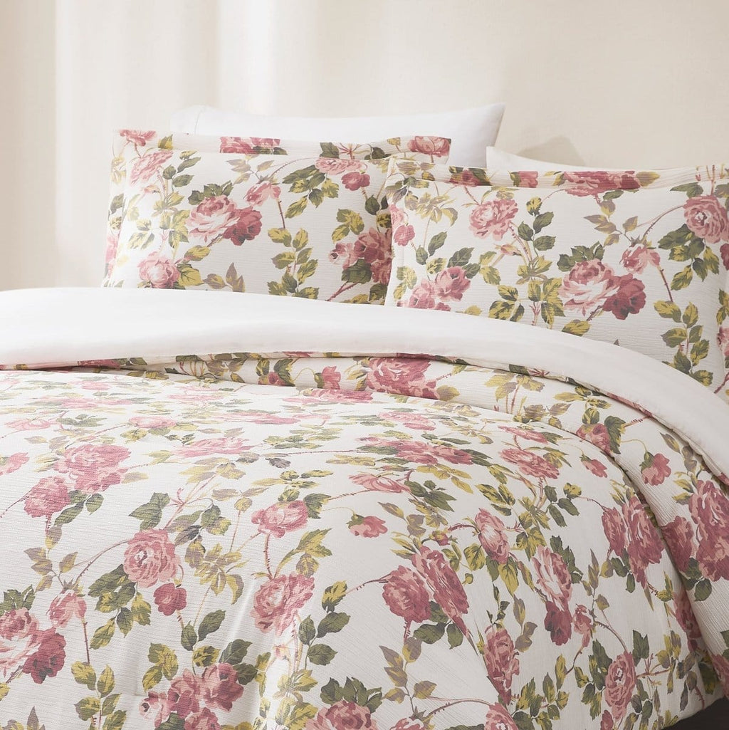 Give your home a romantic refresh with this vintage inspired floral comforter set. Displaying roses in soft hues, this set is made for the modern coquette aesthetic. Crafted from a crinkle textured microfiber with a medium weight polyfill, this comforter offers both softness and breathability. This 3 piece bedding set includes 1 comforter and 2 shams. STANDARD 100 by OEKO-TEX® certified, all components have been tested and certified free from harmful substances. Machine washable for easy care.