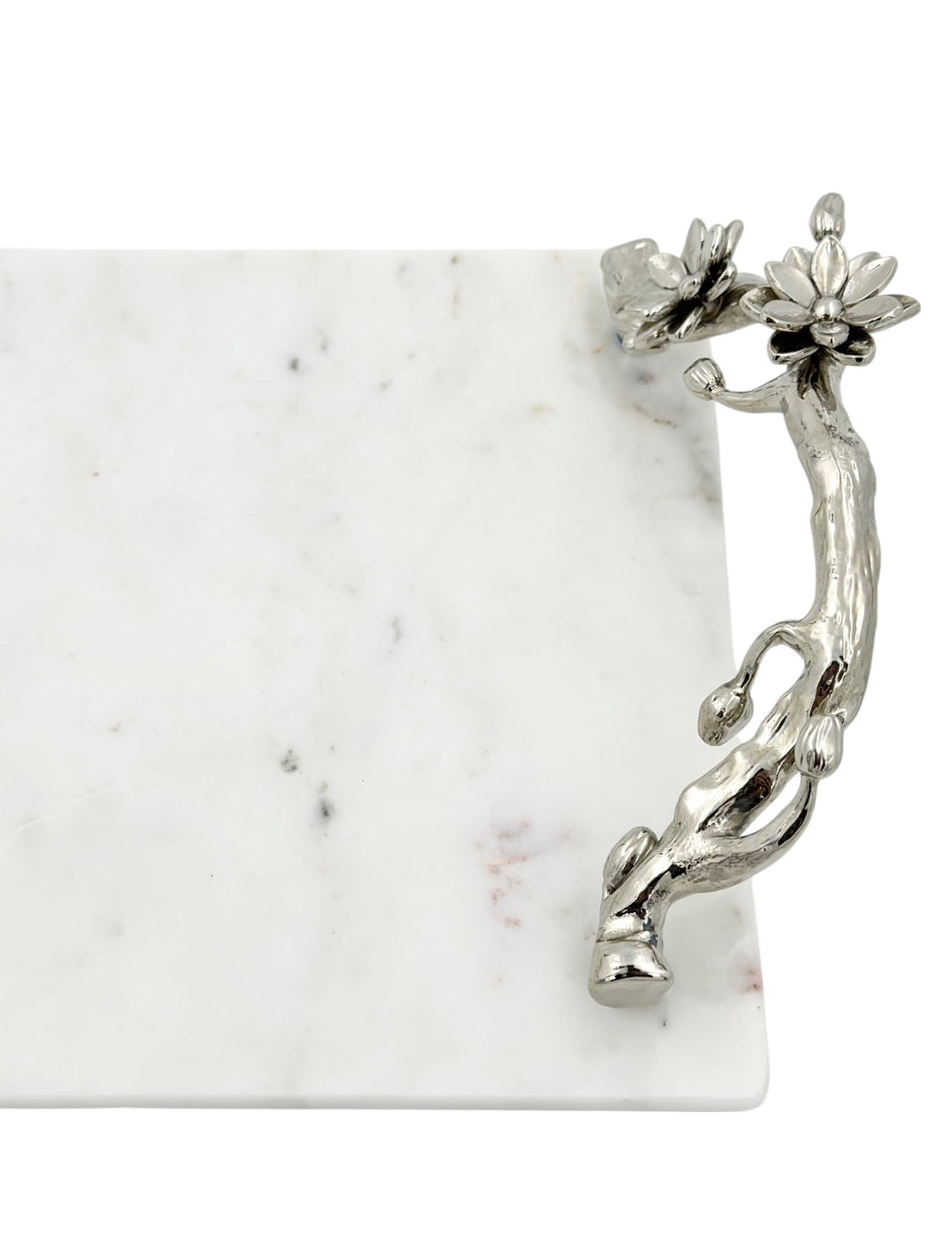 This elegant rectangular tray is crafted from richly veined white marble and features intricately detailed electro-formed handles, available in gold or silver finishes. Measuring 9x14 inches, it blends natural luxury with artistic flair — perfect for serving or as a statement décor piece.