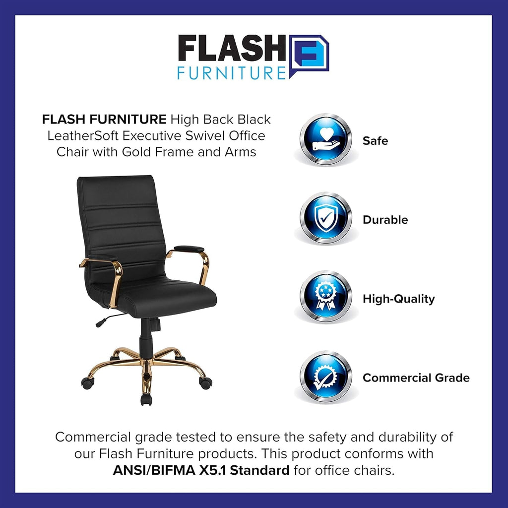 Designed for longevity and daily use, this chair brings a sophisticated, professional look to any desk, salon, shop, dorm, or study space. The soft black LeatherSoft back and seat pair with a durable gold metal base and refined stitching for a polished, contemporary vibe.
