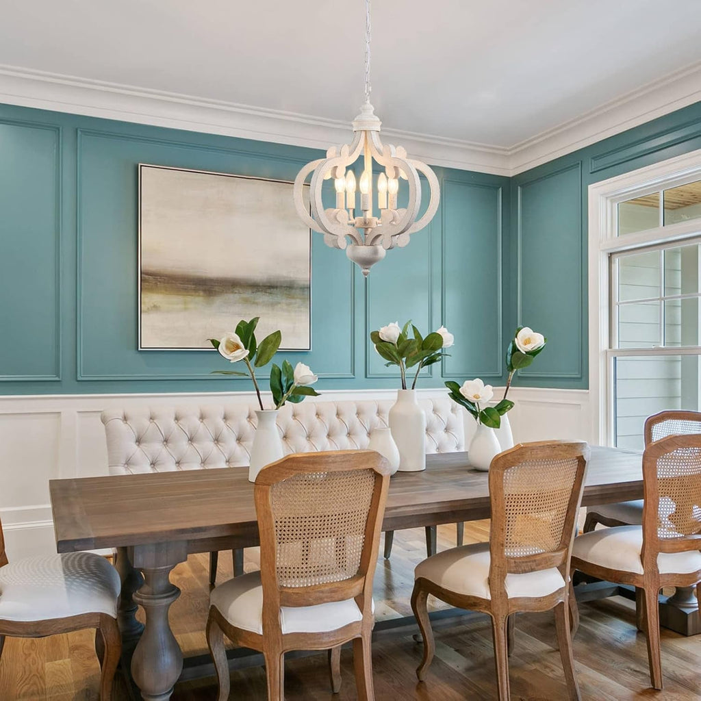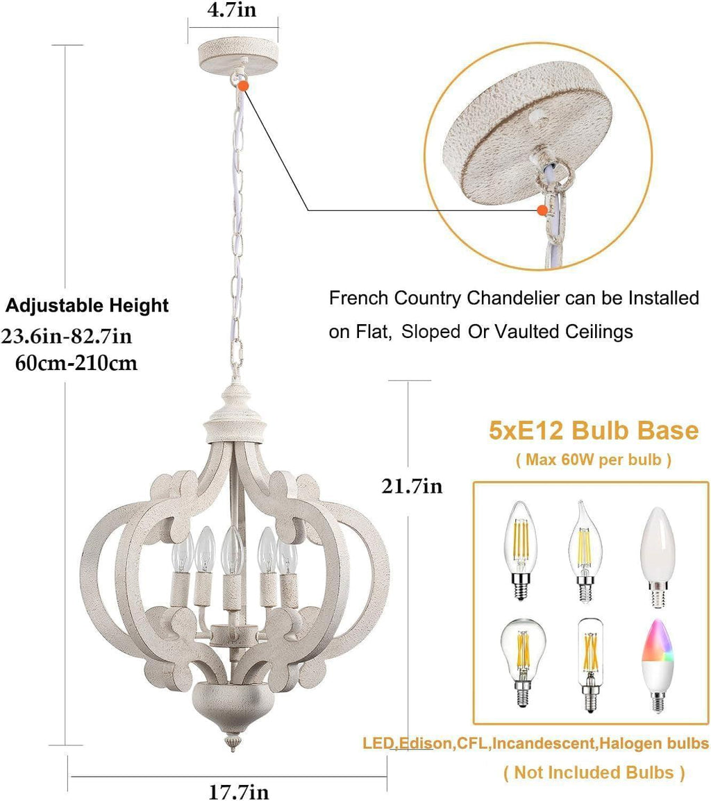 Brighten your space with timeless farmhouse charm. This Wooden Farmhouse Chandelier in distressed white delivers five glowing candle-style lights from a sturdy wood frame, blending vintage French country flair with practical modern lighting. Perfect for dining rooms, kitchens, and entryways, it creates a welcoming focal point with a warm, ambient glow.