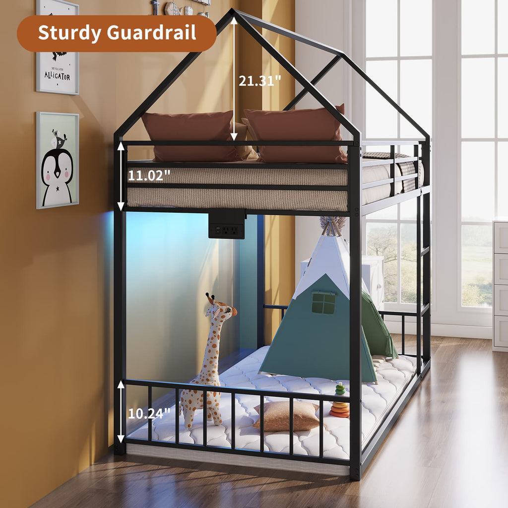 Yanosaku BF019-BK-T Twin Bunk Bed Frame with Charging Station & RGB LED, Easy Assembly, Storage Space, House Metal Frame with Ladder