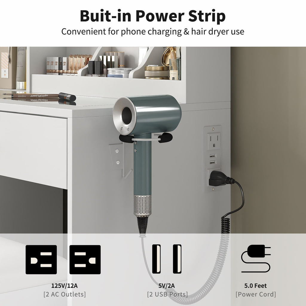 Charging Station & Holder: This makeup vanity desk with lights is designed with a hair dryer holder and a charging station that includes two AC outlets and two USB ports, which makes it easier to connect your hair dryer, and curling iron or other mobile devices, and ensures you have a seamless and efficient beauty routine every day.