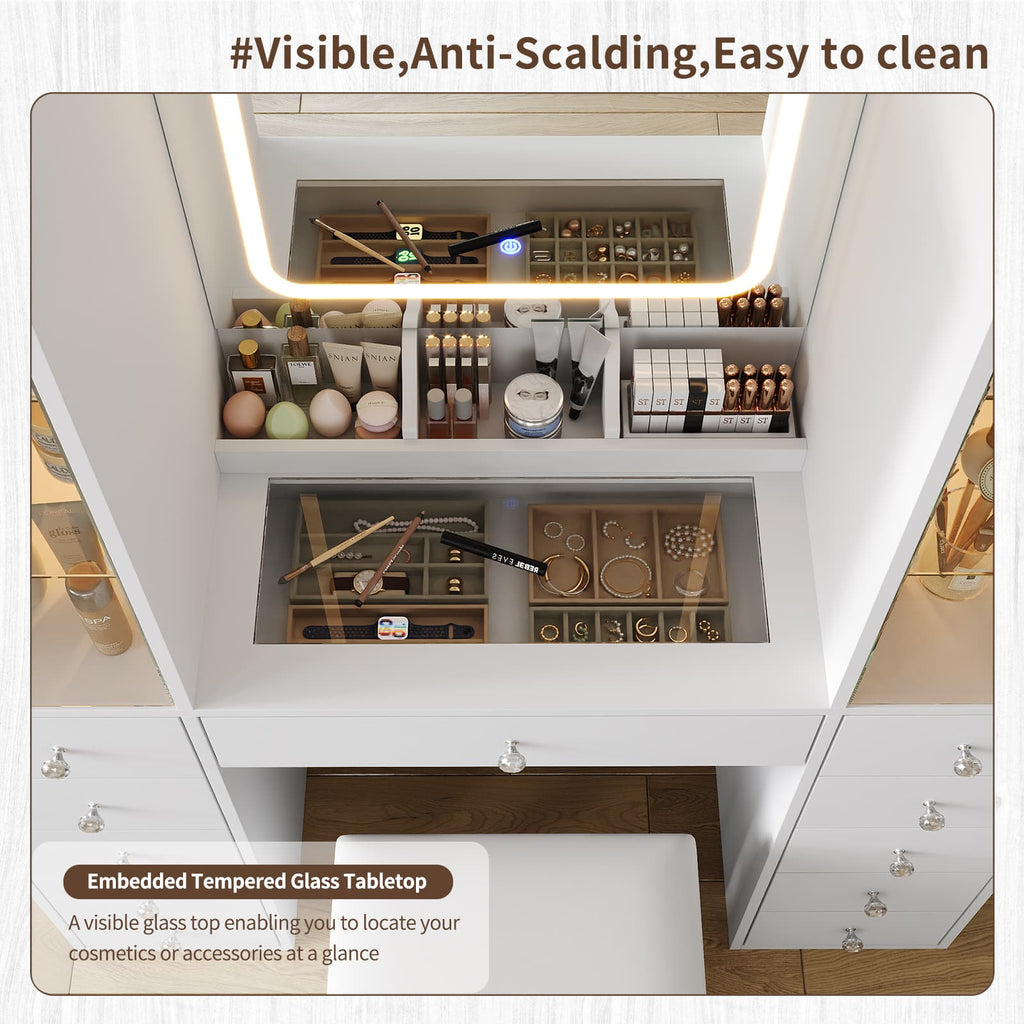 Massive Storage & Sleek Organization:Never clutter your space again! Featuring 11 large sliding makeup drawers and 2 lighted storage cabinets, this vanity keeps your beauty area well-organized. The cabinets include adjustable shelves, allowing you to customize the layout to suit your needs. Perfectly designed to hold all your cosmetics while keeping everything visible and within reach.