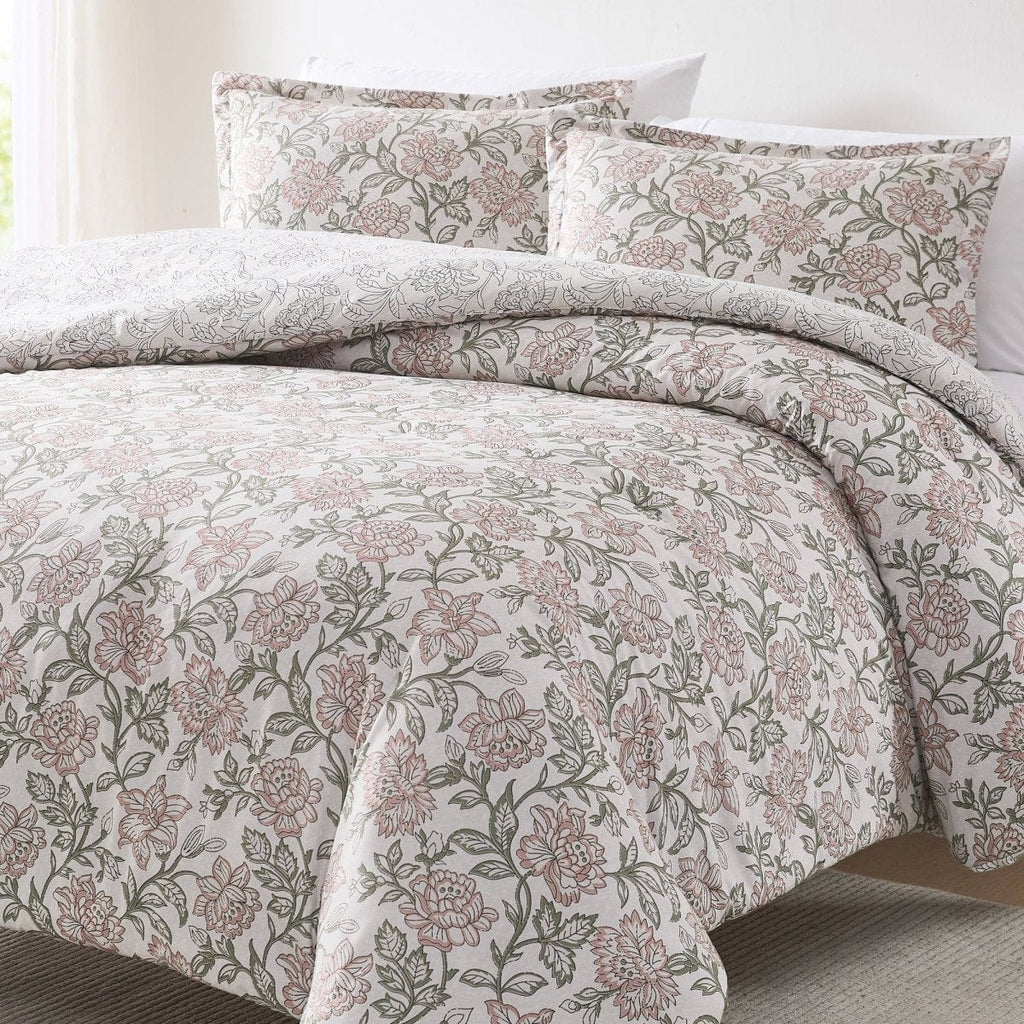 Add florals to your space with this charming comforter set. Designed with a traditional flower block print, this floral bedding blends boho and modern decor styles. The fully reversible design offers 2 beautiful color options. Crafted from a soft microfiber with a medium weight polyfill. This 3 piece bedding set includes 1 comforter and 2 shams. STANDARD 100 by OEKO-TEX® certified, all components have been tested and certified free from harmful substances. Machine washable for easy care.
