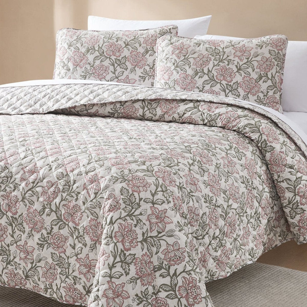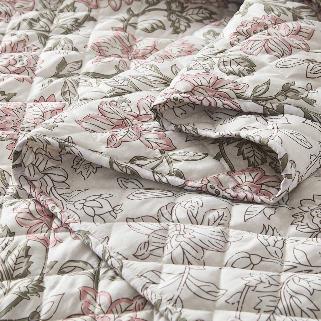Add florals to your space with this block print quilt set. Designed with a traditional flower block print, this floral bedding blends boho and modern decor styles. The fully reversible design offers 2 beautiful color options. Crafted from a soft microfiber with a lightweight polyfill. This 3 piece bedding set includes 1 quilt and 2 shams. STANDARD 100 by OEKO-TEX® certified, all components have been tested and certified free from harmful substances. Machine washable for easy care.