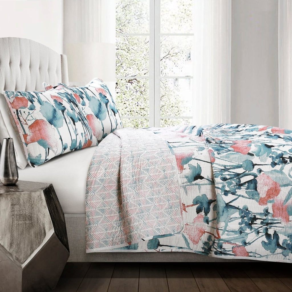 The reverse side of the Zuri Flora Quilt 3 Piece Set features a geometric print in soft coral and blue tones. The reversible nature of this quilt gives you the option to switch up the look of your room as often as you like simply by turning the quilt over to the other side.